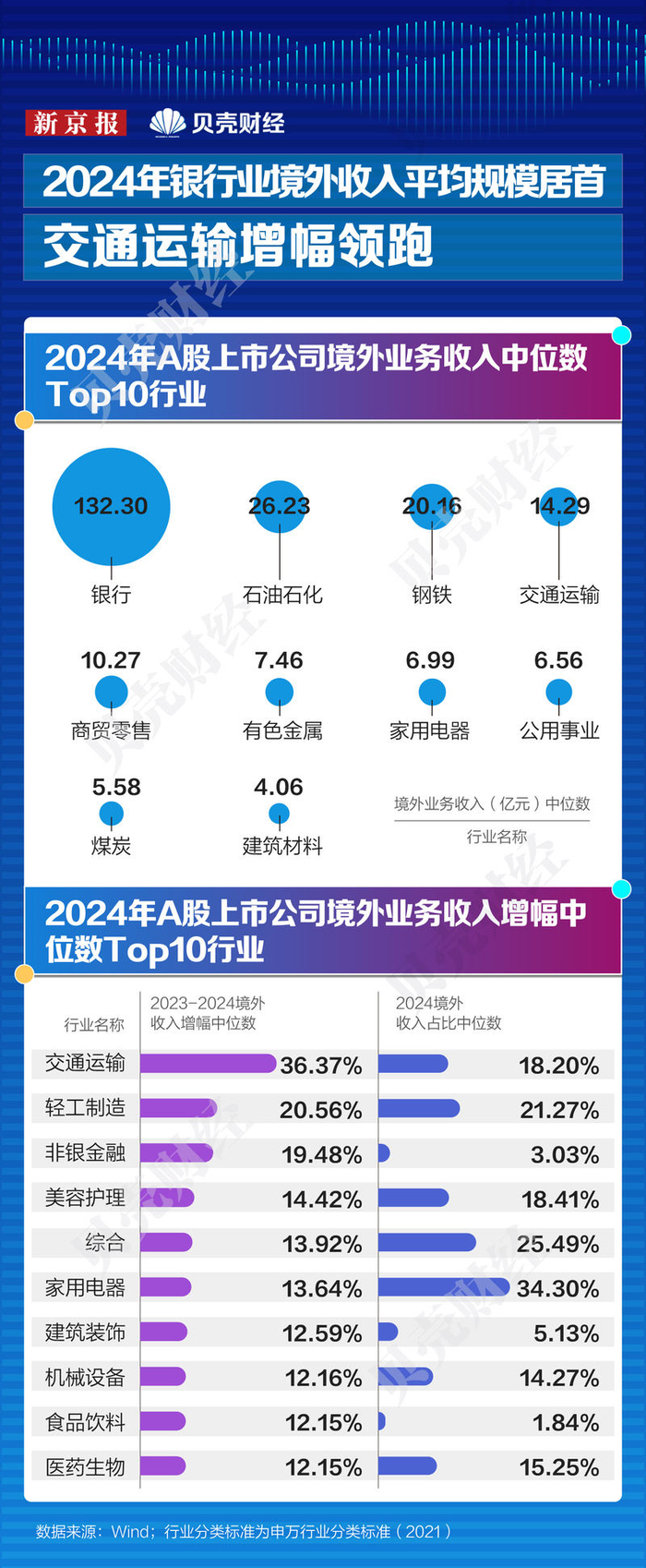 值得注意的是,交通运输、家用电器为两个同时居于境外收入平均规模及同比增幅前十的行业,体现了这两个行业在国际市场中的双重优势。