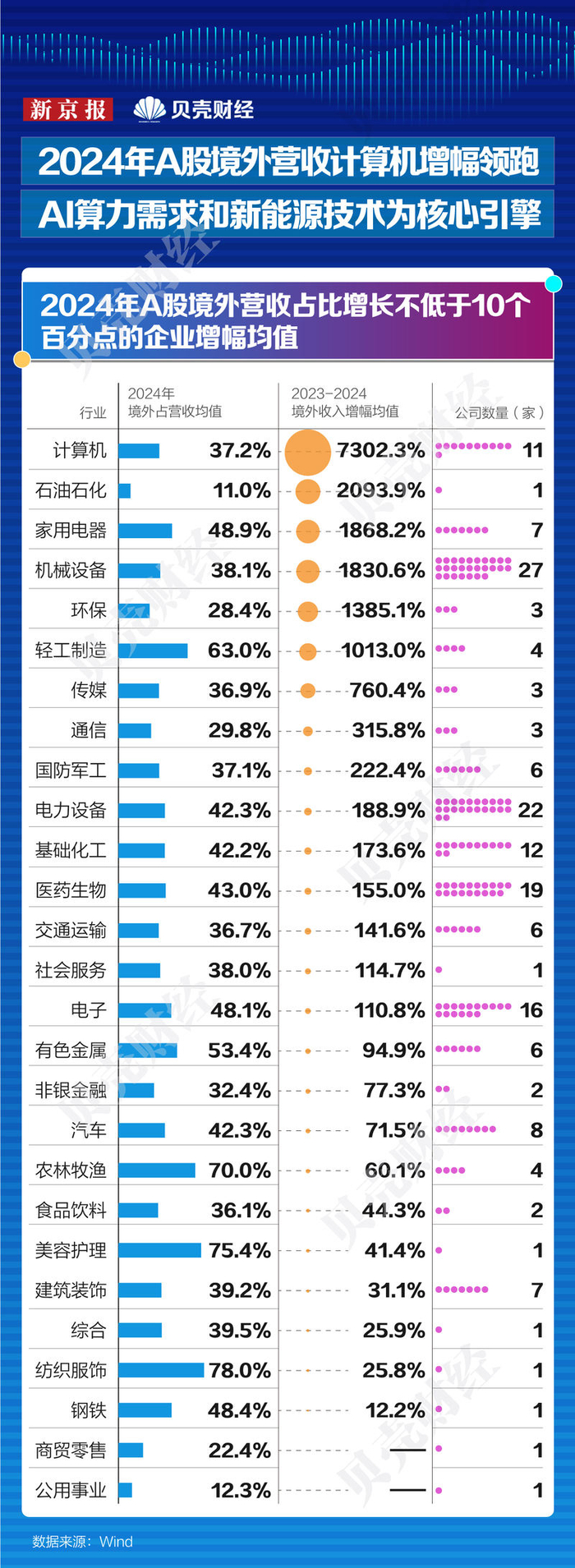 新京报贝壳财经记者整理分析2022-2024年A股上市公司的境外业务收入情况,筛选出近三年境外营收占比持续上涨且在近一年增长不低于10个百分点的176家上市公司。其中,机械设备、电力设备行业企业分别为27家、22家;医药生物、电子、基础化工、计算机行业企业数量超10家,分别为19家、16家、12家、11家入围;另有21个行业企业数量在1至8家之间。