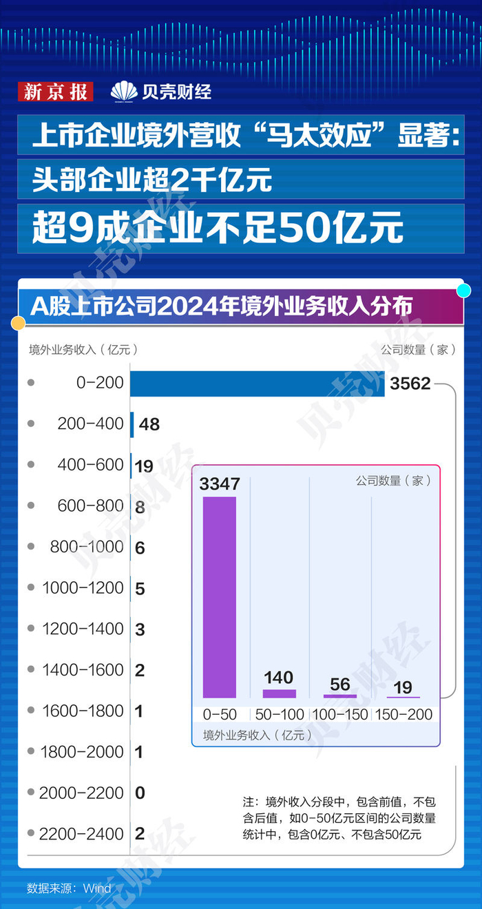 Wind数据显示,截至2025年6月3日,2024年A股全部上市公司披露的境外收入总额已达9.4万亿元,较2023年增长近8%;其中,实现境外收入的上市公司,其境外营收总额占比达19.4%,较2023年提升2.5个百分点。
