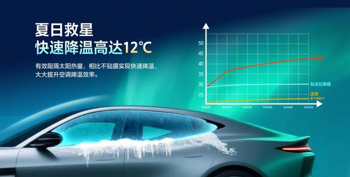 国产高端科技窗膜品牌法拉第关注到这一市场需求,创新提出“纳米制冷”科技技术路径,突破以往传统窗膜的隔热局限,带来全新的颠覆性凉感体验。与未粘贴车膜相比,法拉第车膜可有效阻隔太阳热量,快速降温效果高达12℃,实现红外线阻隔率94%,太阳能总阻隔率52%,大大提升空调使用效率。据测算,在“纳米制冷”技术加持下,一辆新能源汽车预估全年可节电855度,有效增加续航里程4285km,为车主带来看得见、可感知的用车体验升级,解决新能源车主“急难愁盼”的夏日用车难题。