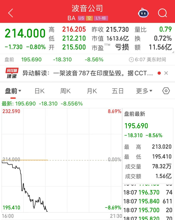 截至发稿前,波音公司美股盘前股价下跌8.56%。