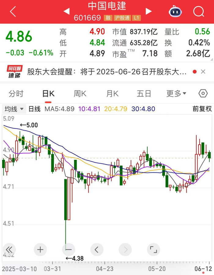 截至今日收盘,中国电建报4.86元,下跌0.61%,成交额2.68亿元,今日主力资金净流入350.87万元。