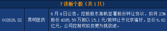 2、换手连板高度(剔除ST股)为7板,易明医药:控制权变更+糖尿病首仿药。