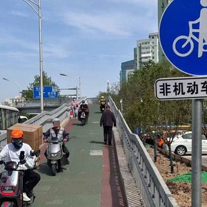 ▲资料图:北三环中路,多辆电动自行车扎堆儿在坡道上行驶。图/新京报记者王贵彬