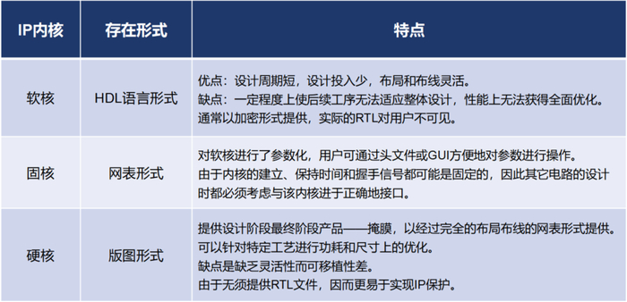 根据特性,IP核可以分为硬核、固核和软核。具体区别可以参考下面的表格: