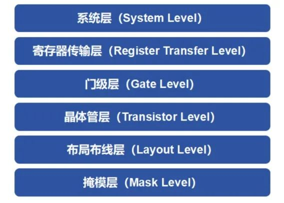 从上到下,依次是:系统层、RTL层、门级层、晶体管层、布局布线层、掩膜层。