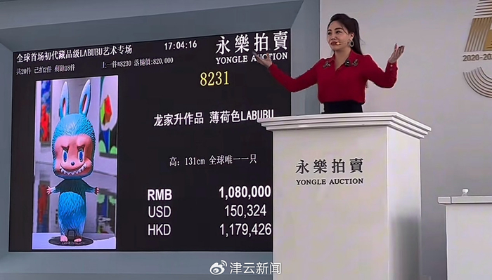 两天之后,LABUBU的“百万身价”就成为了现实。6月10日,“初代藏品级LABUBU艺术专场”在网络平台直播,画面显示,该拍卖活动由永乐拍卖举办。直播过程中,一款显示为初代藏品级薄荷色的LABUBU最终以108万元的价格完成竞拍。