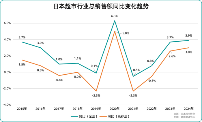 据《日本超市协会》数据,2024年日本超市行业全店销售额同比增长3.9%,连续第三年增长。然而,这种增长更多依赖商品单价上涨,从而抬高客单价。消费者实际购买件数下降,来客数持续负增长。分品类看,一般食品与生鲜农产品分别增长4.5%与4.4%,成为核心驱动力。