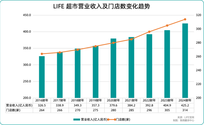 具体看LIFE超市,2024财年它以约425亿人民币营收稳居食品超市榜首,营业利润同比增长4.8%。2016-2024财年期间,LIFE营收年均复合增长率达3.2%,年均净增门店约6家,单店营收实现1.8%的年均增长,彰显“质量优先于数量”的战略定力。