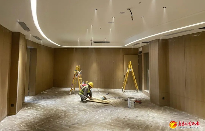 6月12日,在乌鲁木齐天山国际机场旅客过夜用房项目施工现场,施工人员在内部包厢区域处理细节部分。