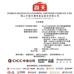 自首次披露港股IPO计划以来,海天味业H股发行计划受到资本市场关注。最新公告显示,此次全球公开发售成功引入HHLR Advisors, Ltd.(隶属于高瓴集团)、新加坡政府投资公司(GIC Private Limited)、加拿大皇家银行(RBC)、源峰基金等8家实力雄厚的基石投资者。海天味业表示,引入上述基石投资者有助于提升公司的知名度,也表明基石投资者对公司的业务及前景充满信心。