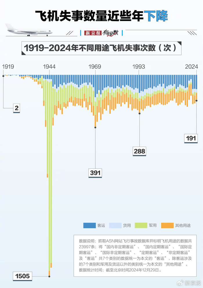 进入21世纪以来,随着航空安全技术的发展,事故量明显下降。2024年全球共发生了190起飞行事故(截至12月29日),是近三年内事故量最少的一年。