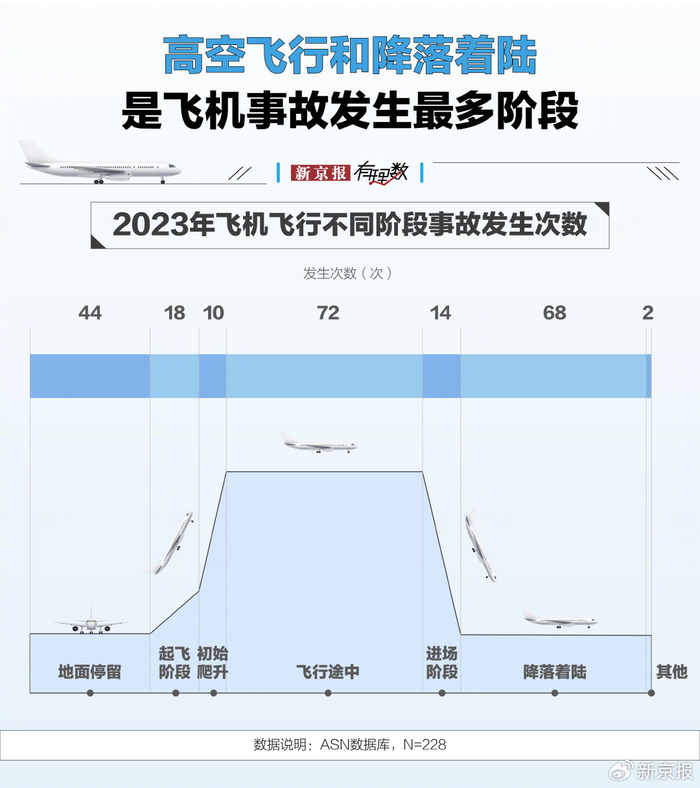 一架飞机的飞行过程可以大致分为起飞、爬升、平飞、下降、降落这5个阶段。不同于人们的刻板印象,从数据来看,飞机平飞阶段比起落时发生的事故更多。