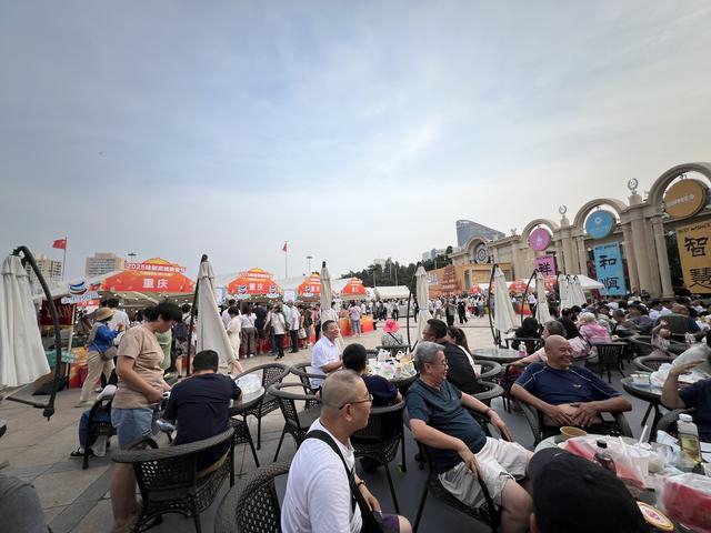 展览馆主楼门前的位置被辟为就餐区,提前安置了百余张桌椅,傍晚6点不到,已经座无虚席。“新疆饭店羊肉串排老长的队,要是排十来个人我也就等着了,但是队伍实在太长了。”一位市民最终端着一杯酸梅汤和一份江西炒米粉回到餐桌,向同伴感慨,“真没想到会这么火爆。”