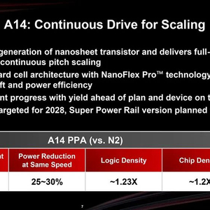 台积电预测,相较于N2工艺,A14在保持相同功耗和复杂度的前提下,将实现10%至15%的性能增长;