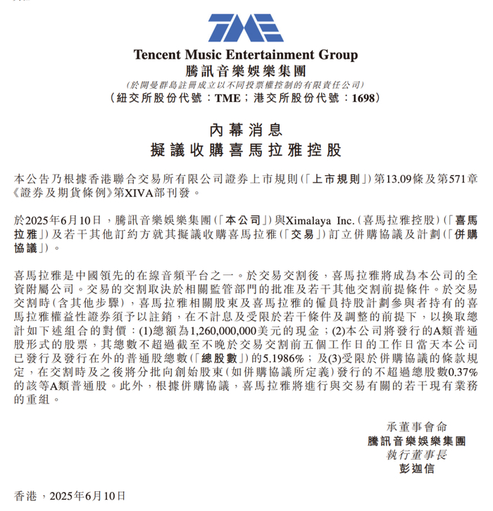 6月10日晚,腾讯音乐发布公告,表示与喜马拉雅及若干其他订约方就拟收购喜马拉雅签订并购协议及计划。