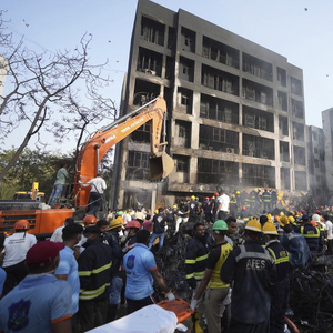 当地时间2025年6月12日,印度古吉拉特邦艾哈迈达巴德机场附近,消防员在飞机坠毁现场工作。