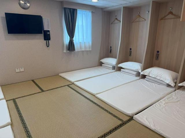 6月12日,澎湃新闻记者登上了“鉴真号”轮,船上设有休闲吧、健身房、棋牌室、歌舞厅、多功能厅和儿童游乐等区域,楼上是客房区域,客房有可住8人的榻榻米,还有固定床位的4人间和移动床位4人间,套房内一间卧室带一个客厅,较为宽敞。