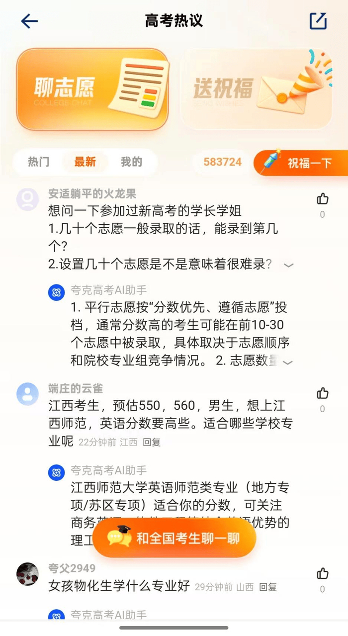 夸克的解决方案为考生和家长提供了一个专门用来交流的“聊志愿”功能,考生与家长可以通过发帖求助的方式提问,夸克高考AI助手会根据提问进行回答,其他人也可跟帖讨论或给出自己的建议。不过目前回答的主力还是夸克高考AI助手。