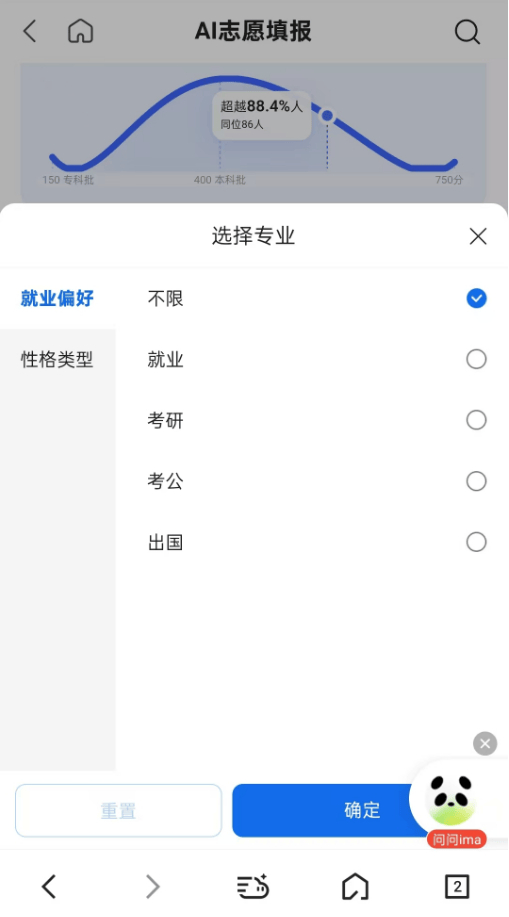 QQ浏览器也选择整合其他产品资源提升志愿推荐能力。QQ浏览器在AI志愿填报界面的右下角添加了一个“问问ima”的入口,点击后会跳转到腾讯的AI智能工作台ima上,通过该APP提供AI咨询服务。不过这需要用户先下载ima APP。