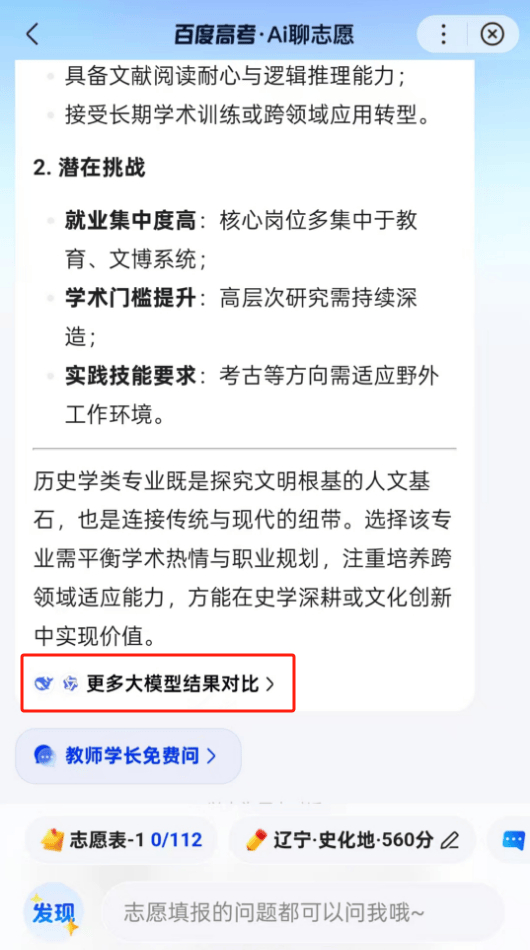 和去年一样,百度APP通过AI聊志愿功能让考生和家长与专门设计的文心·高考版大模型对话。不过今年百度APP还集合了DeepSeek和通义千问这两个大模型,让用户可以直接对比不同大模型的回答。