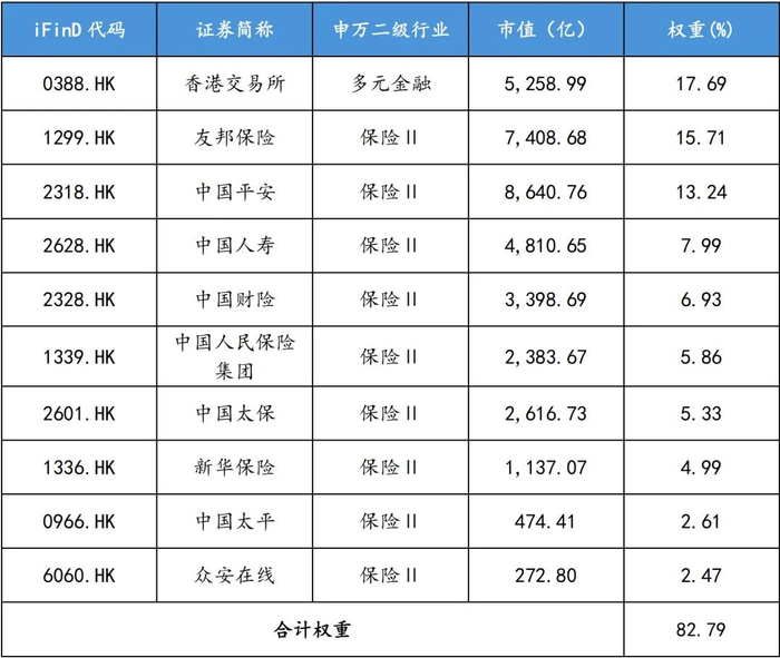 按照恒生三级行业分类,指数前三大细分行业分别为保险(65.11%)、其他金融(17.69%)、证券及经纪(8.74%)。