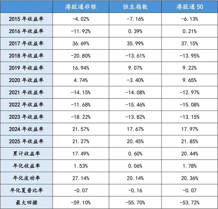 数据来源:iFinD(由于港股通非银指数基期为2014/11/14,故统计区间为2014/11/14-2025/6/10)。历史数据不代表未来收益,指数过往表现不预示未来收益。市场有风险,投资需谨慎。
