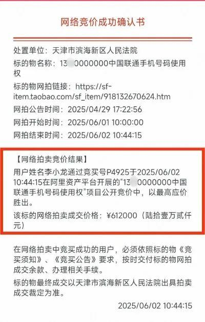 尾号“0000000”手机号拍出61.2万,买家“李小龙”已付尾款,仅享有使用权
