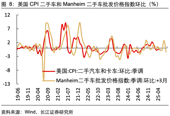 总结来看,核心商品通胀中汽车、服装价格均回落,且二手车CPI的领先指标Manheim二手车批发价格指数指向未来二手车CPI环比增速在短暂上升后将继续回落,综合而言,美国核心商品通胀压力可控。