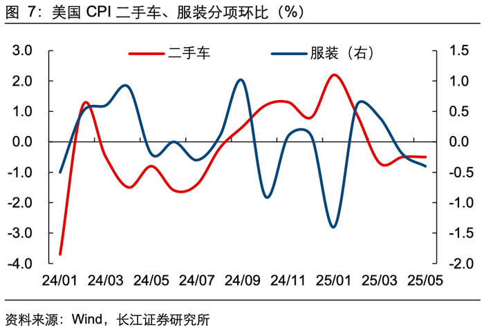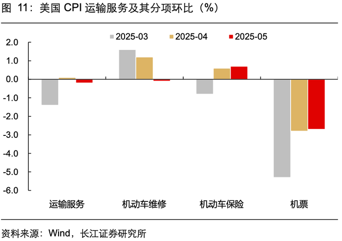 汽车方面,5月美国新车价格环比增速续降,二手车价格环比增速持平,两者合计贡献5月整体CPI涨幅-0.02pct。