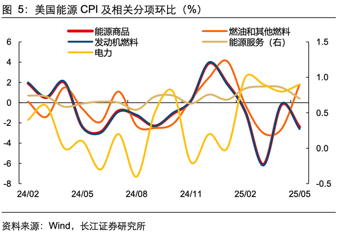 能源CPI环比增速则转负,分项来看,能源商品、能源服务价格环比增速同步放缓,两者合计对5月整体CPI环比贡献-0.06pct。