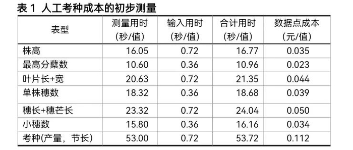 如上所述,表型调查是不可或缺的关键环节,但其成本问题不容忽视。传统的小麦表型调查主要依赖人工测量和记载。无论是小麦育种团队还是从事小麦遗传解析的团队,为了获取全面且准确的小麦品种或系的表型数据,都需要投入大量人力物力开展调查工作。以我们2017-2018年在河北省赵县秋播小麦表型调查为例,当时共有11,487个小区,日工价为60元/工。调查内容涵盖田间的最高分蘖数、小穗数、株高、旗叶长宽、穗长和芒长等性状,以及收获后在库房进行的茎秆分节长、茎粗、单穗产量、单株产量等指标测定。仅从用工成本角度测算,在所调查的众多表型数据点中,最高分蘖数的调查成本最低,为0.023元/值,而产量数据的调查成本最高,达到0.112元/值,其余数据点成本在0.034元至0.050元/值之间(具体成本数据见表1)。