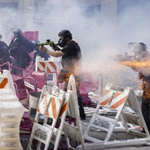 6月8日,美国加利福尼亚州洛杉矶,爱德华·R·罗伊巴尔联邦大楼附近,警察清除抗议移民突袭行动人士设置的临时路障并爆发冲突。视觉中国供图
