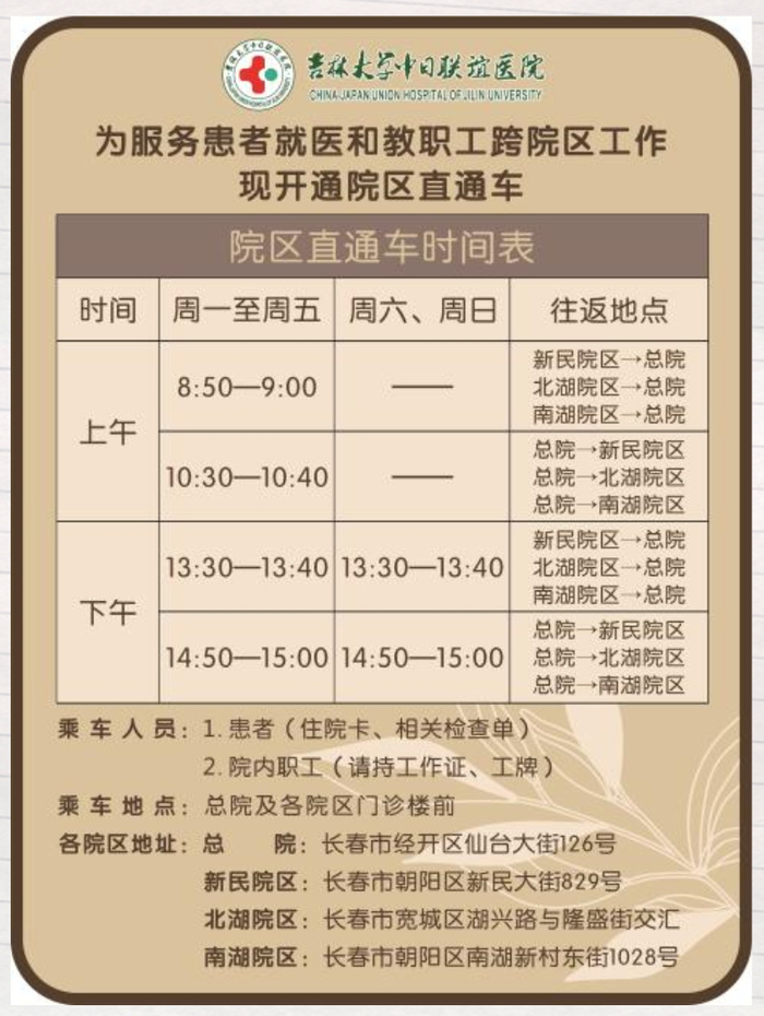 【通车】6月12日,往返于吉林大学中日联谊医院总院(中心院区)、新民院区、北湖院区和南湖院区之间的直通车正式开通。