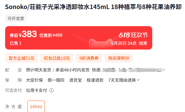 不仅价格大甩卖,现在购买,还赠送价值383元的荘能子光采净透卸妆水(正装145mL*1瓶)。