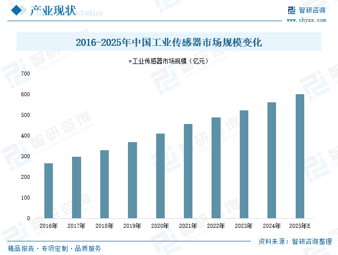 随着工业4.0的快速发展,工业智能化、网联化进程不断加速,工业传感器作为智能制造的核心组件,在工业4.0中扮演着不可或缺的角色。在此背景下,近年来我国工业传感器市场规模呈现不断扩大态势。数据显示,2024年我国工业传感器市场规模已从2016年的267.5亿元增长至560.5亿元。未来,随着人口老龄化程度加深、劳动力成本增加和制造业转型升级,企业对自动化、智能化生产的需求也将随之上升,进而拉动工业传感器需求增长。再加上利好政策推动,预计我国工业传感器市场增长空间仍然较大,发展潜力十足。根据预测,到2025年我国工业传感器市场规模有望突破至600亿元。