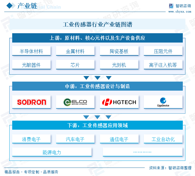 工业传感器行业产业链上游为原材料、核心元件以及生产设备供应环节,主要包括半导体材料(如硅基MEMS晶圆、SOI晶圆)、金属材料(如铂电阻丝、应变合金)、陶瓷基板、高分子材料(如聚酰亚胺薄膜)等核心材料,压阻元件、热电偶、光敏器件、芯片等核心元器件,以及光刻机、离子注入机等关键设备。产业链中游为工业传感器设计与制造环节,代表厂商有宜科电子、索迪龙、汉威科技、汇顶科技等。产业链下游为工业传感器应用领域,主要包括消费电子、汽车电子、通信电子、工业自动化、能源电力等工业制造环节。