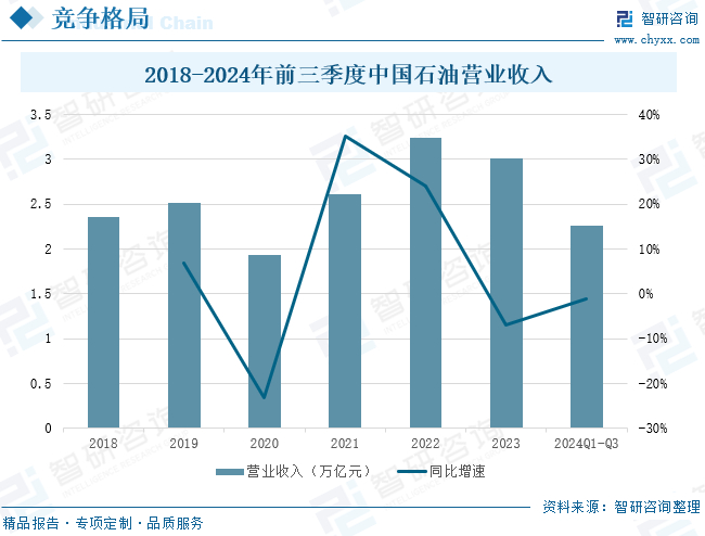 中国石油是中国油气行业占主导地位的最大的油气生产和销售商,是中国销售收入最大的公司之一,也是世界最大的石油公司之一。中国石油主要业务包括:原油及天然气的勘探、开发、生产、输送和销售及新能源业务;原油及石油产品的炼制,基本及衍生化工产品、其他化工产品的生产和销售及新材料业务;炼油产品和非油品的销售以及贸易业务;天然气输送及销售业务。2024年前三季度,中国石油实现营业收入2.26万亿元,同比下降1.13%。