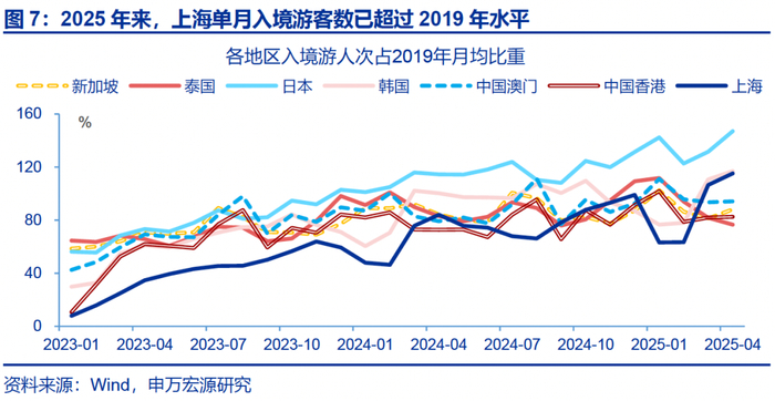 从客源结构看,东南亚等地游客的入境游修复幅度较大,而美国等地游客的入境游复苏较慢。2024年上海接待的游客中,来自东南亚比重是22.5%、较2023年上行6.8pct;来自韩国的游客占比与2023年持平;而来自北美游客占比较2023年下行2pct。北京接待的境外游客也有类似特征,2025年前4月来自除日韩外亚洲的游客比重较2019年上行13pct;而美洲游客占比回落11.9pct。