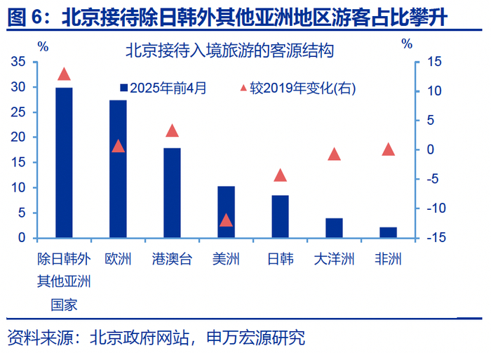从客源结构看,东南亚等地游客的入境游修复幅度较大,而美国等地游客的入境游复苏较慢。2024年上海接待的游客中,来自东南亚比重是22.5%、较2023年上行6.8pct;来自韩国的游客占比与2023年持平。相比之下,来自北美、日本等地的游客占比有较大幅度回落,分别较2023年下行2、1.7pct至11.5%、8.6%。北京接待的境外游客也呈现类似特征,2025年前4月来自除日韩外其他亚洲地区的游客比重为29.9%、较2019年上行13pct;而来自美洲的游客占比仅10.3%、较2019年回落11.9pct。