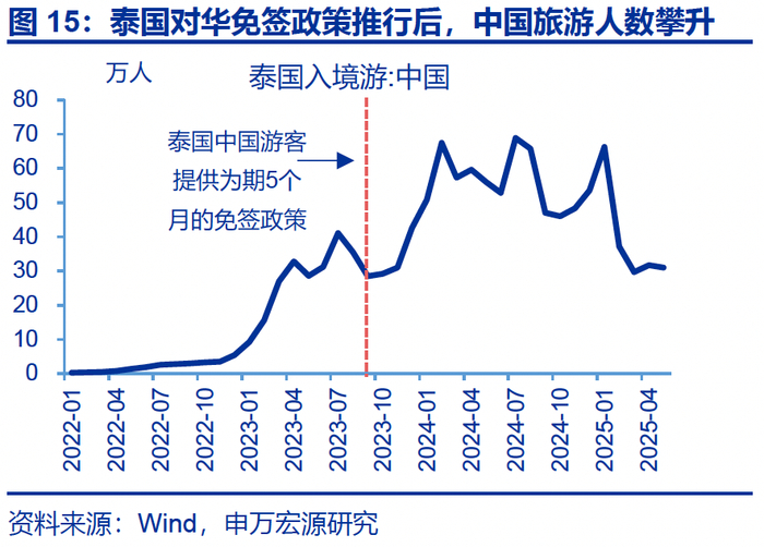 前期入境游恢复节奏偏慢,而2024年来对外开放的工具箱持续上新,免签等便利化政策加码有力拉动入境游市场。2023年以来,我国入境游恢复速度滞后于海外国家;然而2024年以来,我国免签范围持续扩容,有力带动入境游市场。截至2024年12月,我国已与25国实现全面互免签证,对38国试行单方面免签、54国实施过境免签;当年通过免签入境的外国人次达2012万、同比达112.3%。2025年来入境旅游人数持续上行,上海、北京接待的入境旅游者单月最高分别达67.1、45.5万,已超疫情前。具体地区看,2024年3月我国与泰国实行永久互免签证;当月泰国至上海的游客数迅速增加至2.1万,较前月增长超四倍。