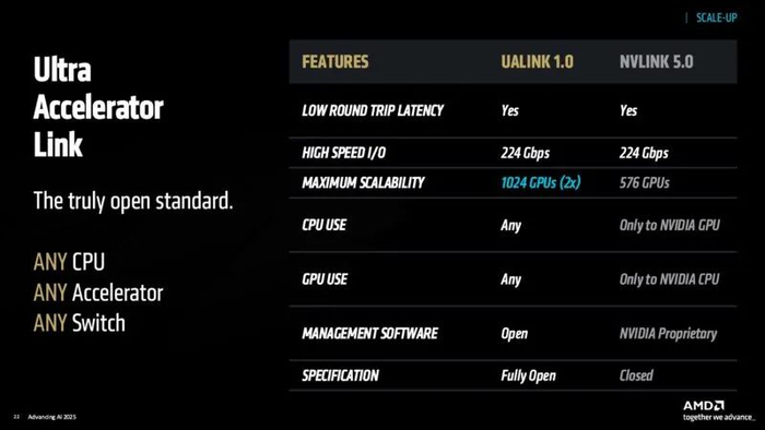 同时,随着下一代 AMD“Helios”机架规模架构的出现,AMD还计划使用 UALink 1.0 来处理其扩展。作为NVIDIA NVLink 5.0 的开放替代方案,AMD 表示其扩展能力几乎是英伟达的两倍,而且还能集成来自多家供应商的组件。AMD 还计划到2026年推出一款名为 Vulcano的800G NIC,一款适用于下一代 PCIe Gen6 集群以及 UALink 和 UltraEthernet 的产品。