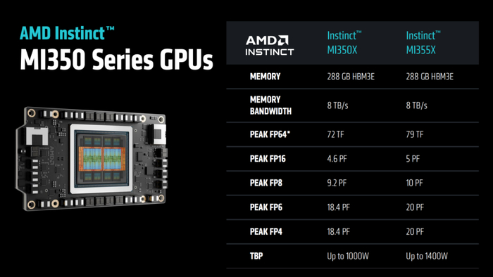 据介绍,MI350X 和 MI355X 采用相同的底层设计,使用3nm工艺(XCD的制造工艺),集成了1850亿晶体管。在HBM方面,均配备高达 288GB 的 HBM3E 内存、高达 8 TB/s 的内存带宽,并新增了对 FP4 和 FP6 数据类型的支持。其中,AMD MI355X 配备的 HBM3E 显存容量更是竞争对手 Nvidia GB200 和 B200 GPU 的 1.6 倍,但内存带宽同样为 8TB/s。