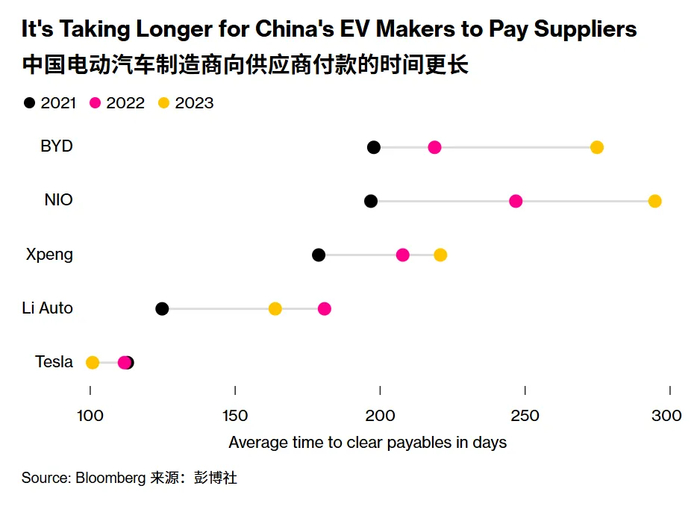 她还引用了一个彭博社的数据,表中显示比亚迪、蔚来、小鹏、理想这几位的付款周期,明显长于特斯拉。