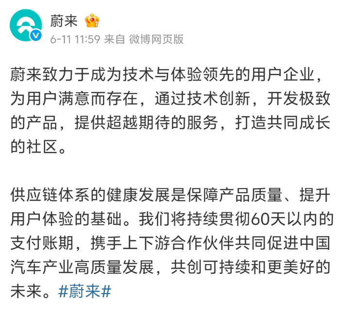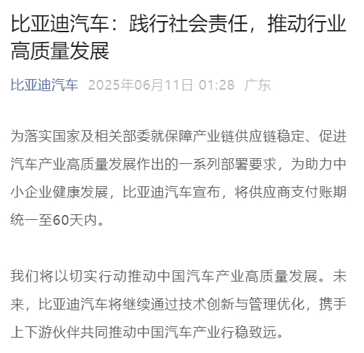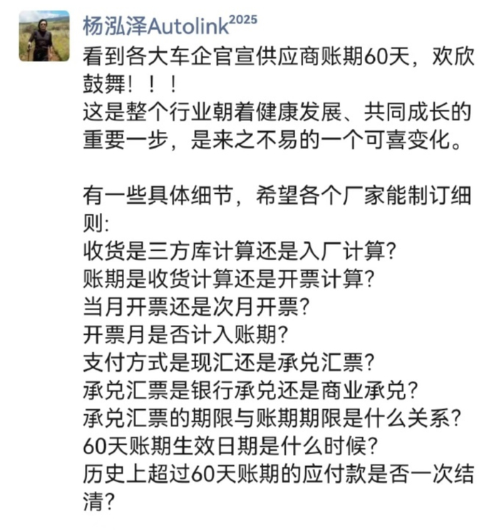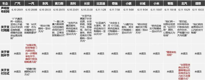 到了第二天,奇瑞、长城、北汽、上汽、江淮全说自己要做到账期 60 天内,还有小米、小鹏、理想、蔚来这些新势力也纷纷响应。