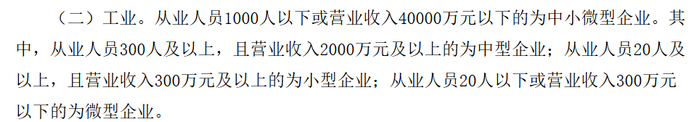 这个大型、中小企业咋区分呢?我翻了下,目前有个 《 中小企业划型标准规定 》 说了,工业行业,1000 人以下或者营业收入 4 亿元以下的,是中小微企业,在这以上的就算大型企业。