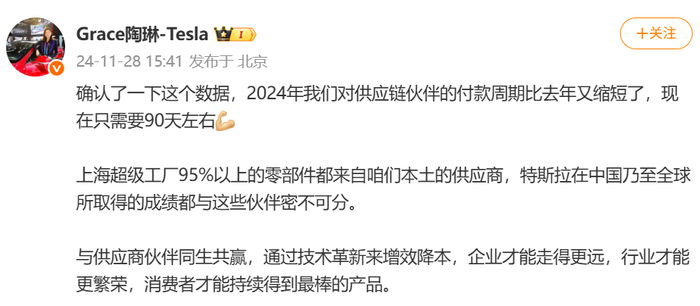 去年,特斯拉副总裁陶琳曾发微博炫耀,说特斯拉的付款周期压缩到了 90 天左右。