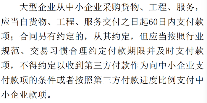 《条例》之所以修订,就是为了解决拖欠货款的问题,里头规定:大型企业从中小企业采购货物、工程、服务,应当自货物、工程、服务交付之日起 60 日内支付款项。