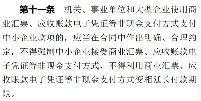 这次 《 条例 》 的第十一条,明明白白写了,不得强制中小企业接受商业汇票。