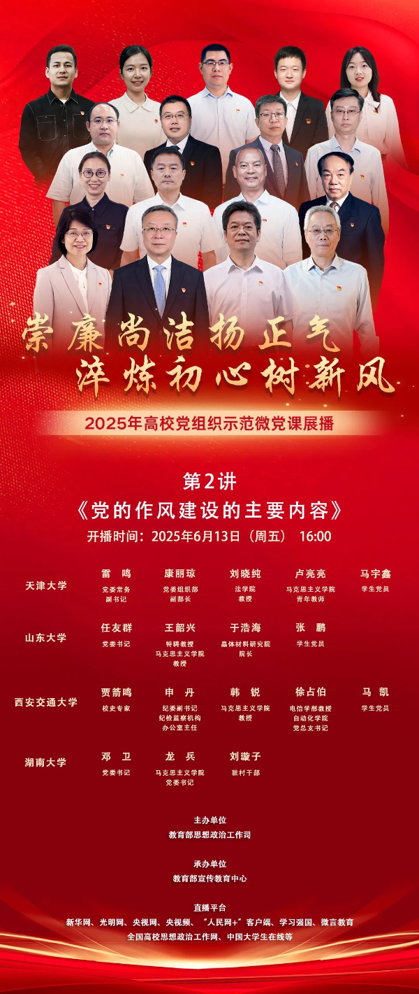 崇廉尚洁扬正气,淬炼初心树新风。6月13日(星期五)16:00,跟随山东大学、湖南大学、天津大学和西安交通大学师生党员,走进2025年高校党组织示范微党课第2讲《党的作风建设的主要内容》。